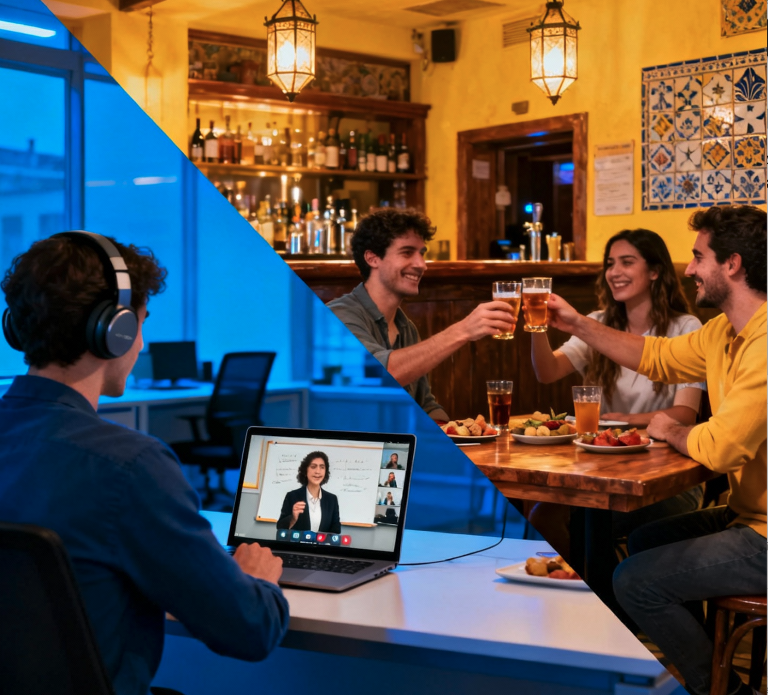 Beyond the classroom, participants receive optional exposure materials — such as Spanish podcasts, curated videos, songs, and a dedicated chat to stay in touch with the language whenever they have time. We understand that professionals often have limited schedules, so our classes are designed to maximize progress even with minimal free time.